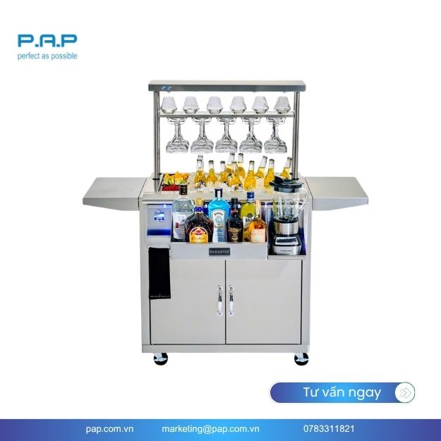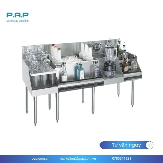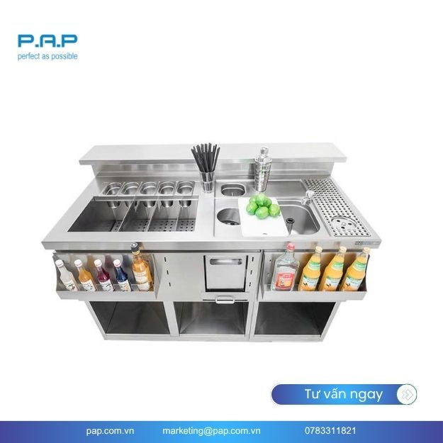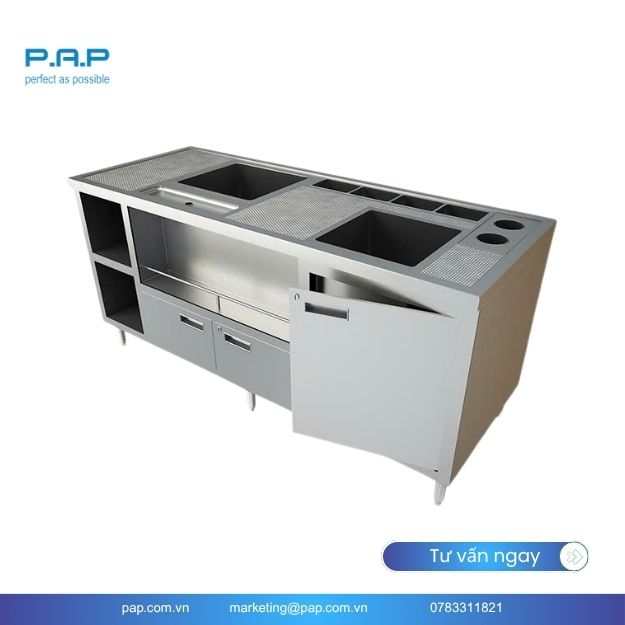 Bên cạnh đó, lợi thế sản xuất trực tiếp tại xưởng giúp P.A.P linh hoạt trong việc thiết kế và gia công theo kích thước thực tế của từng công trình. Các sản phẩm có thể được tùy chỉnh về kiểu dáng, công năng và thông số kỹ thuật để phù hợp với quy mô vận hành của nhà hàng, khách sạn, bếp ăn công nghiệp hoặc quầy bar, góp phần tối ưu hiệu quả sử dụng và chi phí đầu tư cho doanh nghiệp.