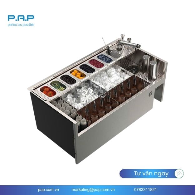 • Gồm thùng đá, chậu rửa, Hộc để chai, khay GN 1/9,…